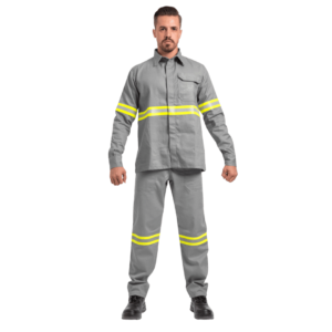 - Faixa refletiva: Confeccionada com tecido retardante à chama, faixa 50mm amarela e prata.